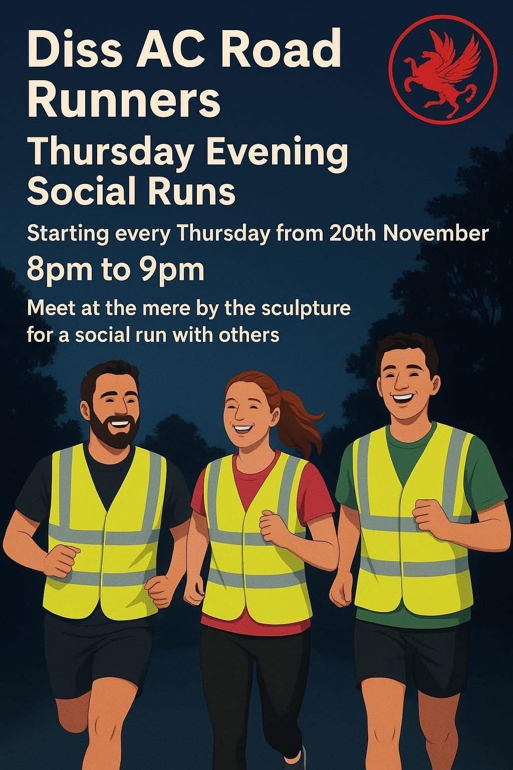 Looking for some company whilst running? We're a really friendly club so come and join us on a Thursday night for a 5k social run around Diss. All are welcome, you do not have to be a member of the club. All we ask is that you complete the attached form below before attending a session as this is a health and safety requirement. Can't wait to meet you all!